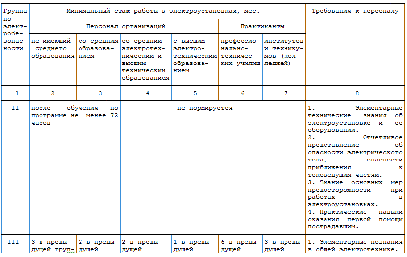 : электротехнический персонал с 3 группой, проработавший в своей должности не менее трех месяцев, при отсутствии среднего образования – 6 месяцев.
