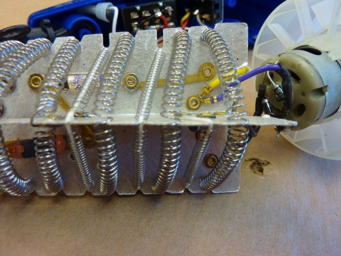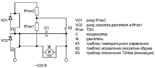 Выключатель фена одновременно замыкает цепь, через которую будут питаться спирали, запускает мотор. Дальнейшая схематика вмешательства определена сложностью: