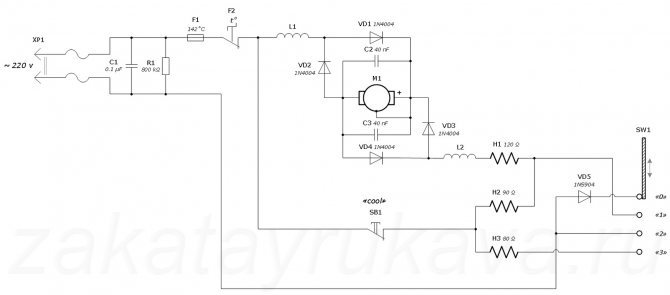 Мотор фена питается постоянным током 12, 24, 36 В. Для выпрямления сетевого напряжения используется диодный мост, в дешевых моделях — одиночный диод. Фильтрация гармоник питания проводится конденсатором, включенным параллельно обмоткам двигателя или входящим в состав более сложного фильтра. Индуктивности ввиду непомерной массы в фенах применяются редко. Поэтому знаний принципов сглаживания пульсаций RC-цепочками хватит, чтобы справиться с построением принципиальной схемы ремонтируемого фена. Иногда фильтрующим элементом используется одна спираль (индуктивность).